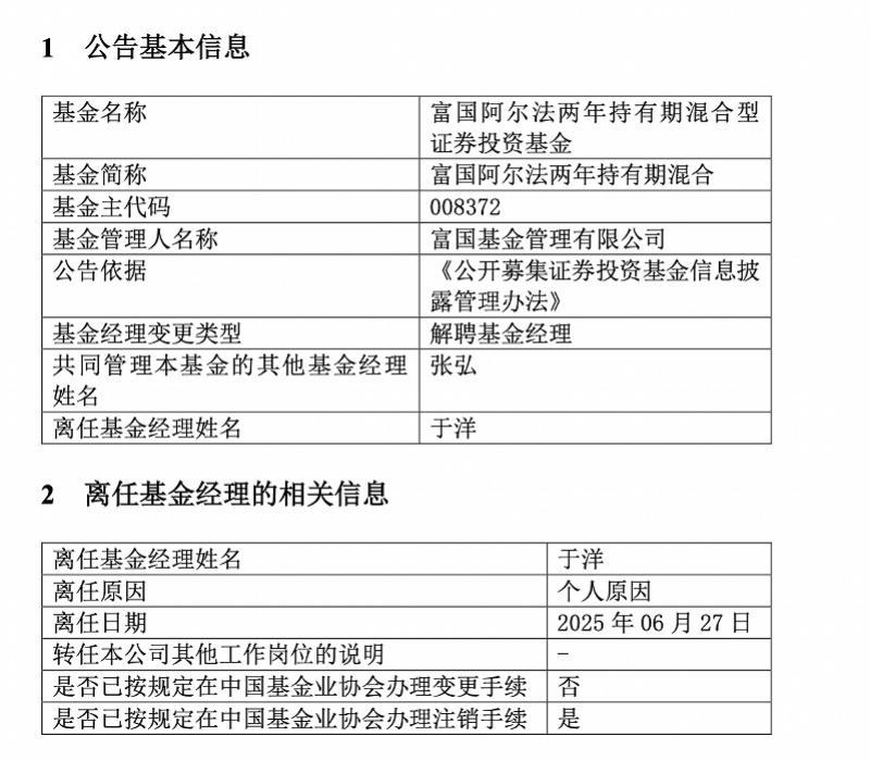 近日,富国基金发布的两则基金经理变更公告在业内引发波澜。公告显示,旗下明星基金经理于洋因“个人原因”卸任其管理的两只产品——富国新动力灵活配置混合与富国阿尔法两年持有期混合。